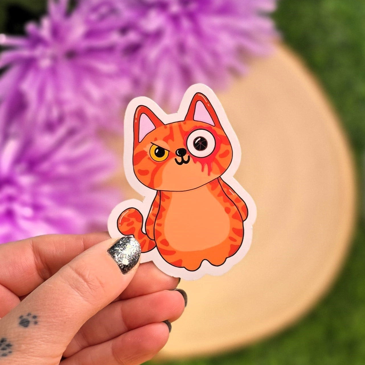 This adorable vinyl sticker features Meatloaf dressed up in a monster-inspired costume, surrounded by the playful words “I only have eye for you.” It’s the perfect mix of spooky, silly, and sweet — ideal for anyone who loves cats with character.
