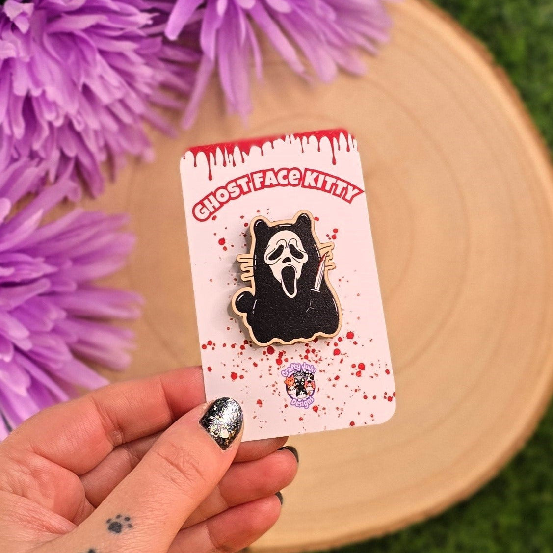 Spooky Ghost Face Kitty Black Cape Cat Wooden Pin | Horror Kitty Collectable Pin